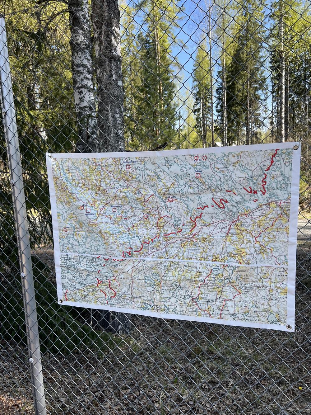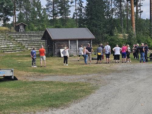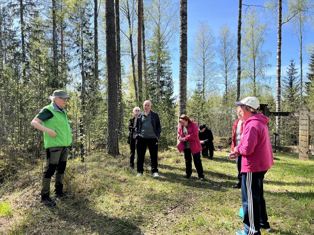Matti Kyöstilän opastamana tutustumassa Salpalinjaan 15.5.2024. Makkarat jäi paistamatta, koska oli kielletty tehdä tulia lämpötilan ja kuivan sään takia.