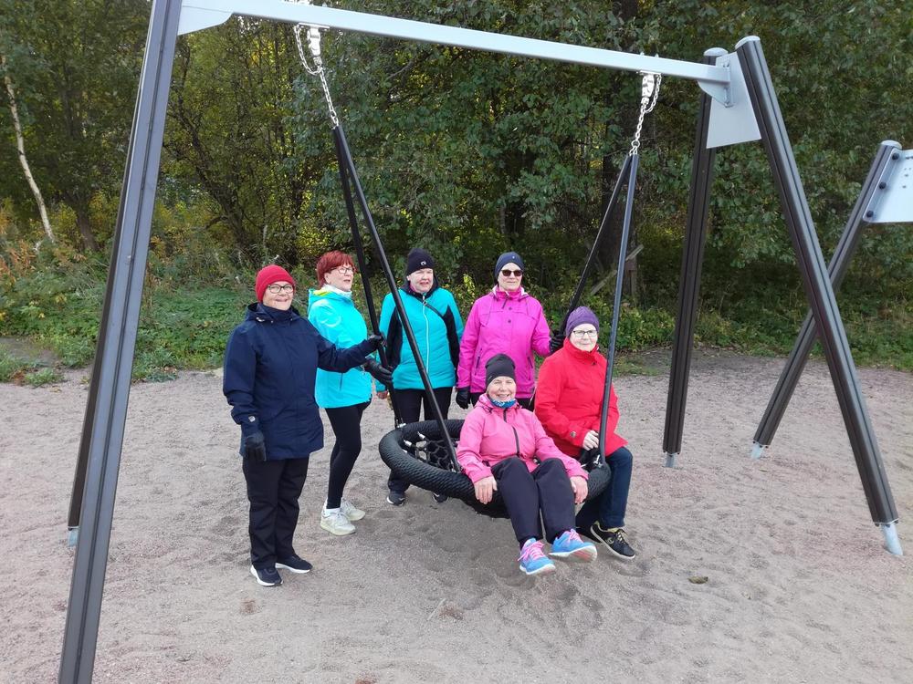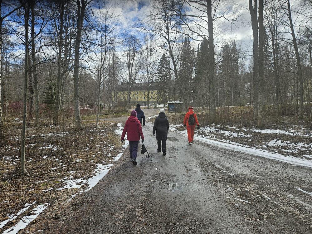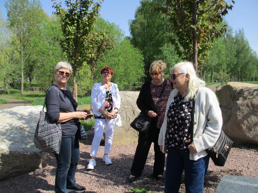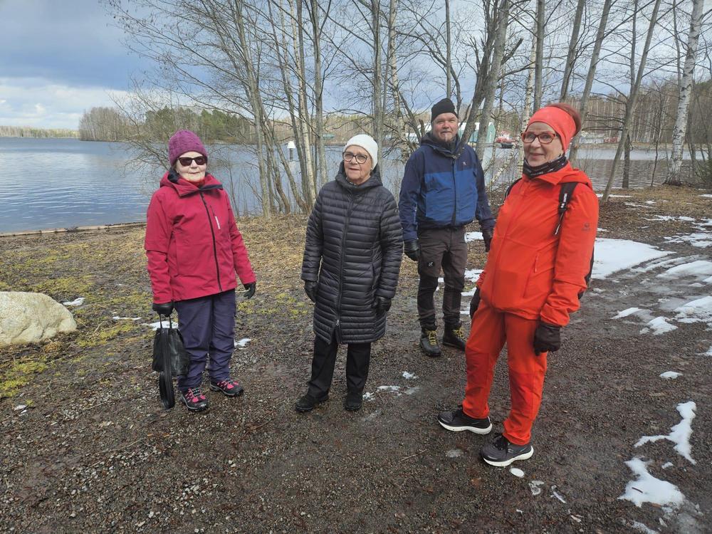 Reippaat ulkoilijat 24.4.2024 Itäisellä rantaraitilla Jusun johdolla. Maija, Kiti, Jusu ja Ritva (Outi kuvasi)