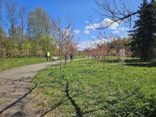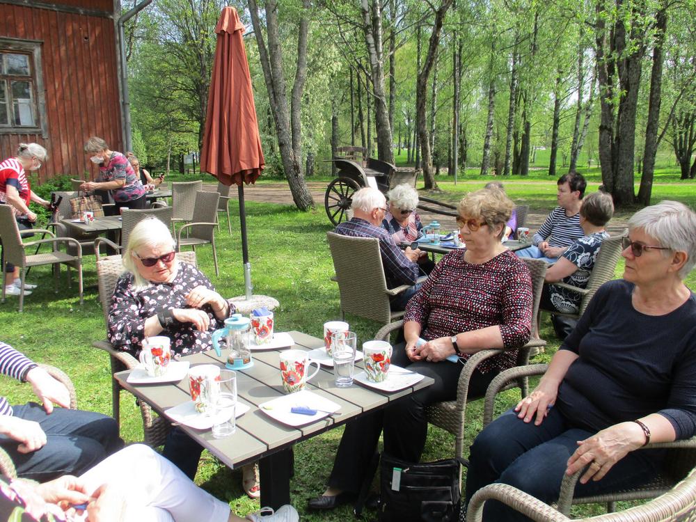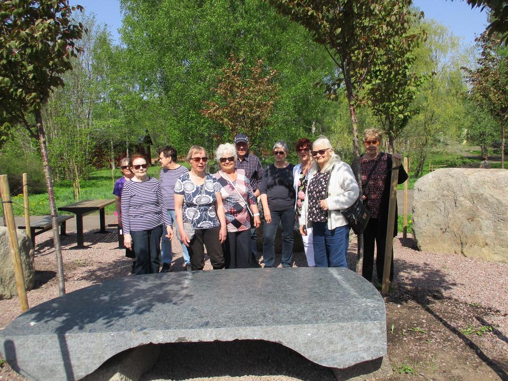 Kävely kirsikkapuistossa, tututuminen Galleria pihaton näyttelyyn ja kahvit Pehtoorin tuvassa 19.5.2021